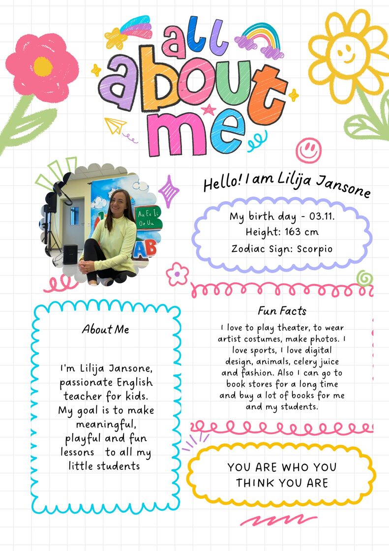Lilija Jansone ir pieredzējusi angļu valodas skolotāja un LILINGO zīmola dibinātāja, kas ar aizrautību māca bērniem angļu valodu jau vairāk nekā 14 gadus. Viņai ir augstākā izglītība angļu valodas pasniegšanā un skolvadībā, kā arī pedagoģiskā izglītība University of Eastern Finland (Somijā). Lilija ir strādājusi Rīgas Centra Humanitārajā vidusskolā, kur mācīja skolēniem angļu valodu no 1. līdz 4. klasei, izmantojot Oxford University Press mācību materiālus. No 2011. gada viņa aktīvi sadarbojas ar vairāk nekā 12 pirmsskolām, kur izstrādājusi savu radošo un efektīvo angļu valodas mācību metodiku. Viņas nodarbības ir enerģiskas, strukturētas un bērniem draudzīgas – katra stunda ir aizraujošs ceļojums angļu valodas pasaulē. Lilija vada angļu valodas tematiskos pasākumus bērniem un vecākiem!